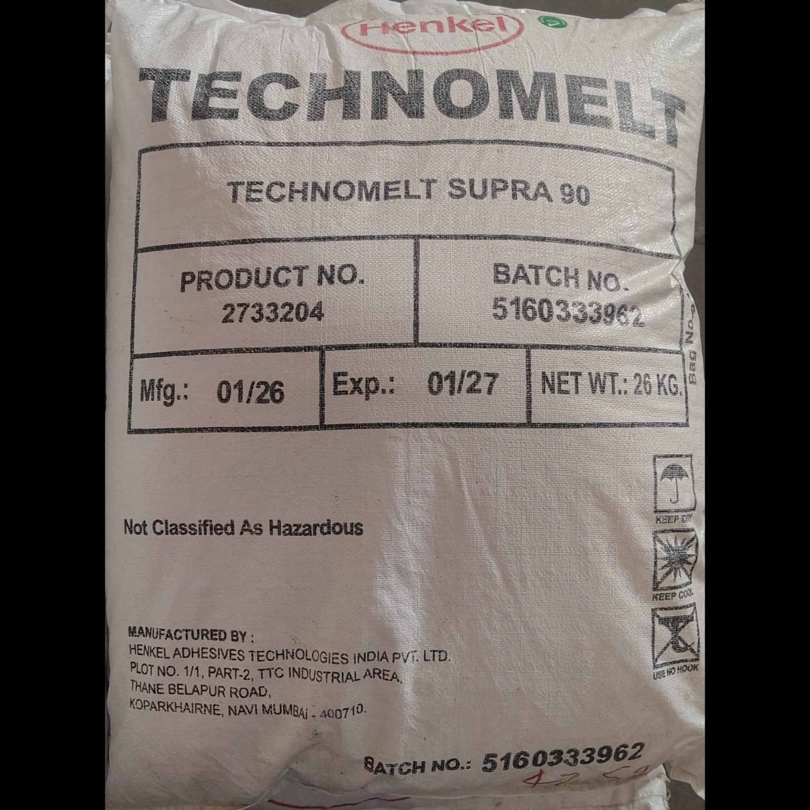 TECHNOMELT SUPRA 90 is a high-performance, white synthetic EVA hot melt adhesive, typically supplied as granules in 25–26 kg bags. Known for high thermal stability, low charring, and high hot tack, it is ideal for high-speed carton, tray, and case sealing.